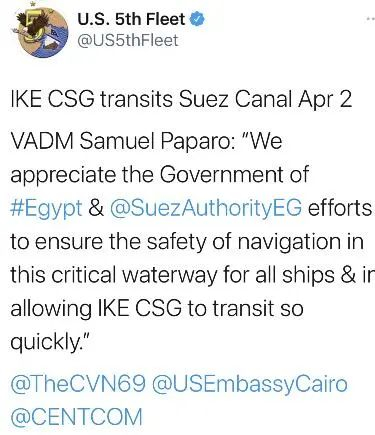 4月3日,美国海军“艾森豪威尔”号航母战斗群官方推特也发文证实了这一消息,文中确认“艾森豪威尔”号航母战斗群已经通过了苏伊士运河,“我们已经完成了苏伊士运河的运输,战斗群很高兴能在红海进行航行和飞行。我们在整个美国第五舰队地区伙伴关系中的重要性是不言而喻的。” “艾森豪威尔”号航母的通过标志着自3月29日苏伊士运河重新开放以来,美国军舰首次通过。