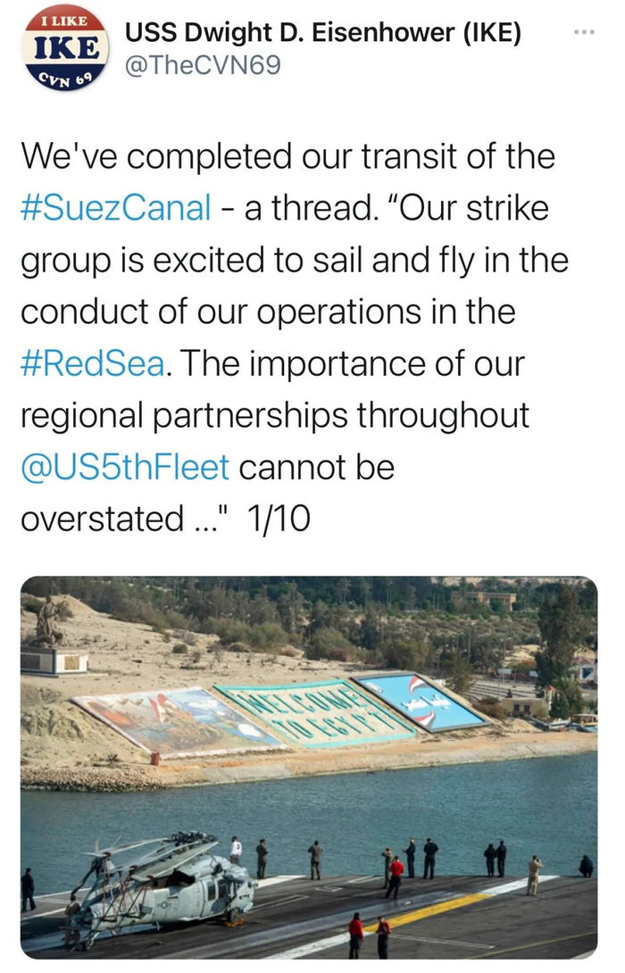 在通过后,“艾森豪威尔”号航母战斗群官方推特和美军第五舰队官方推特还发文对埃及政府进行了感谢:“我们感谢埃及当局政府为确保所有船只在这条关键航道的航行安全所做的努力,并且使得“艾森豪威尔”号如此迅速地通过。”