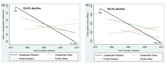在 1992 年,丹麦生殖生物学家 Elisabeth Carlsen 在对全球 61 项研究的荟萃分析后发现,在截至1991年的50年里,全球性的精子计数下降40%以上。