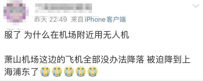 去年6月17日晚上9点,多位小时新闻读者报料,杭州萧山国际机场范围疑似有人飞无人机,导致这一时段的航班无法降落,“好几架无人机,肉眼都能看到。”