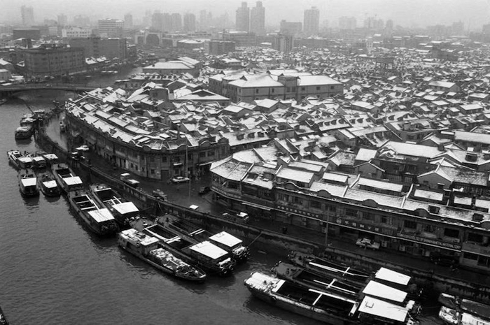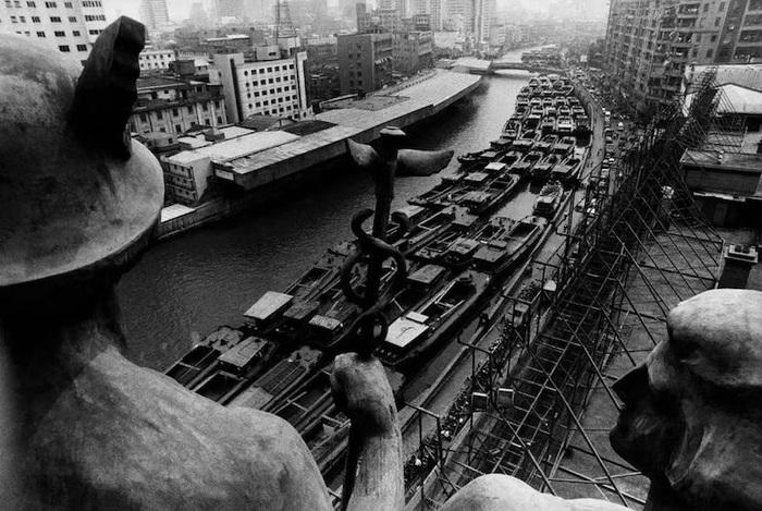 摄影师陆元敏拍摄的“苏州河”系列中有一批从建筑制高点俯拍河流的照片。