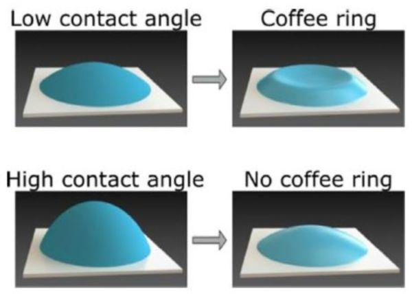 我们的研究确定了液滴在表面悬浮形成的接触角及其固体含量是咖啡环形成的两个重要的调节变量。虽然之前已经实现了成功的建模,但我们在这里首次表明,对于每个接触角,都有一个关键的初始胶体体积分数,超过这个分数就不会形成环状图案。从本质上讲,接触角越低,发现环状轮廓的可能性越大。当一个液滴被放置在一个表面上时,它很快就会达到一个表观平衡位置,对于小液滴来说,这个位置可以仅由接触角和半径来定义。液滴表面的蒸发速度和质量流动性的变化取决于许多因素,包括流体的蒸汽压力、液滴表面的几何形状以及周围大气的速度和分压。