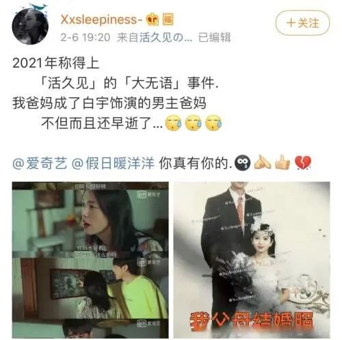 2月6日晚,有微博博主爆料称,自己遇到了活久见的情况!父母的结婚照被《假日暖洋洋》剧组当作遗像出现在了电视剧的画面中,成了白宇饰演的男主角侯昊的爸妈,还早逝了”。