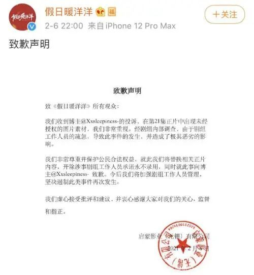 当一天,《假日暖洋洋》官方微博发布一则《致歉声明》称,已收到相关网友的投诉,在第21集正片中出现未经授权的图片素材。经剧组内部调查,由于剧组工作人员的疏忽,导致此事件的发生,并造成了极其恶劣的影响,在此致歉,将替换相关正片内容,并开除涉事剧组的工作人员,承诺永不录用,同时就此事向爆料网友致歉。今后剧组将加强剧组工作人员管理坚决遏制此类事件再次发生。