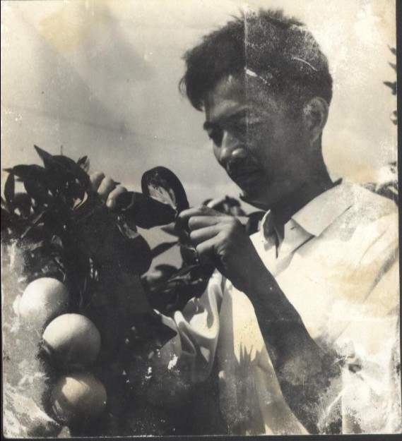 1978年10月,袁守根在脐橙母本园观察虫害的情况。