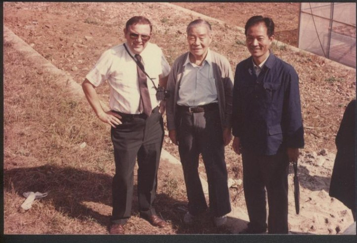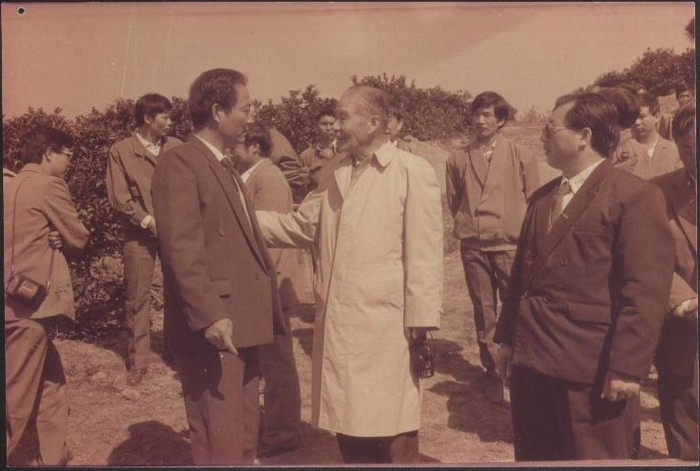 1992年,章文才教授(右3)来信丰指导脐橙生产,钟祖恩、袁守根陪同,钟祖恩(右1)时任信丰县委书记。