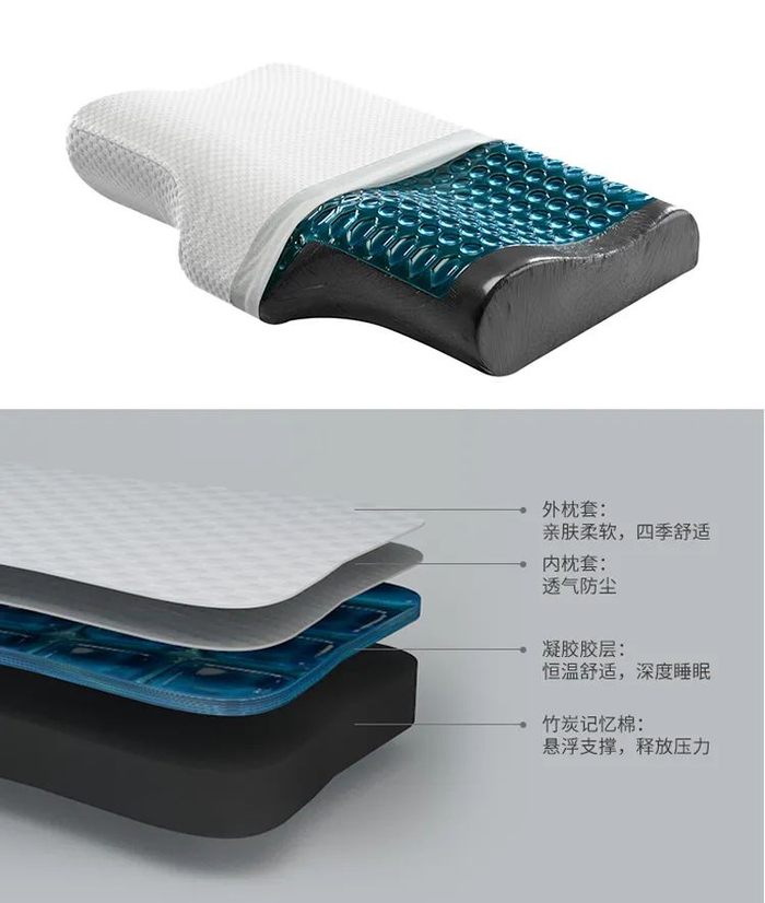 而这款凝胶记忆棉枕头,上面是凝胶,下面是竹炭记忆棉。
