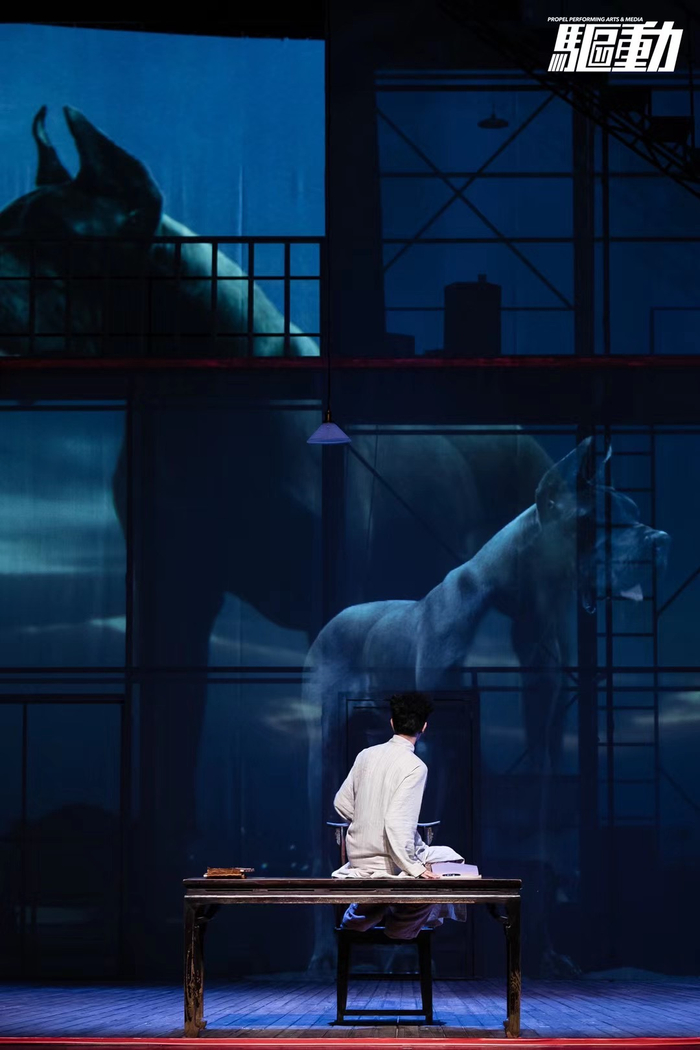 剧中看到影像大量采用,把对于鲁迅的理解体现在自己的创作里面。这个舞台作品本身是鲁迅的氛围和味道,但是有一点觉得不符合我的理解。我觉得他有一些意向做得太写实。那只狗太像真的。还有一些舞台做得很好,铁屋子有这么一个概念,包括狂人也是一种意向,这个门,这个大哥,都是对中国传统文化某一种象征处理,我觉得非常喜欢。