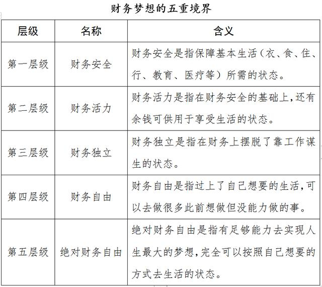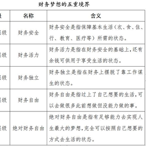 与此较为接近的一个概念“财务自由”(Financial Freedom)似乎更为人所熟知。但何为财务自由?它与财务独立有何差异?细究起来,恐怕一般公众也未必清晰。美国财富研究学者托尼•罗宾斯根据个人生活品质和需求的提升,将财务梦想分为五级,依次为财务安全、财务活力、财务独立、财务自由及绝对财务自由。