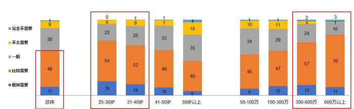 随着当前金融市场、金融产品的复杂性日益提升,越来越多的投资者单靠个人金融素养和过去的经验,已很难作出有效的投资决策,难以跑赢市场。首期“植信中国财富指数”显示,缺乏获取高质量投资信息的渠道是富裕家庭投资决策的主要痛点,国内近六成的富裕家庭需要专业投顾服务,其中,“比较需要”的占48%,“极其需要”的占11%。从资产规模看,流动资产600万元以上的富裕家庭需要专业投顾服务的人群占比为81%,流动资产300万元-600万元的富裕家庭需要投顾的比例为57%,流动资产100万元-300万元的富裕家庭需要投顾的比例47%。