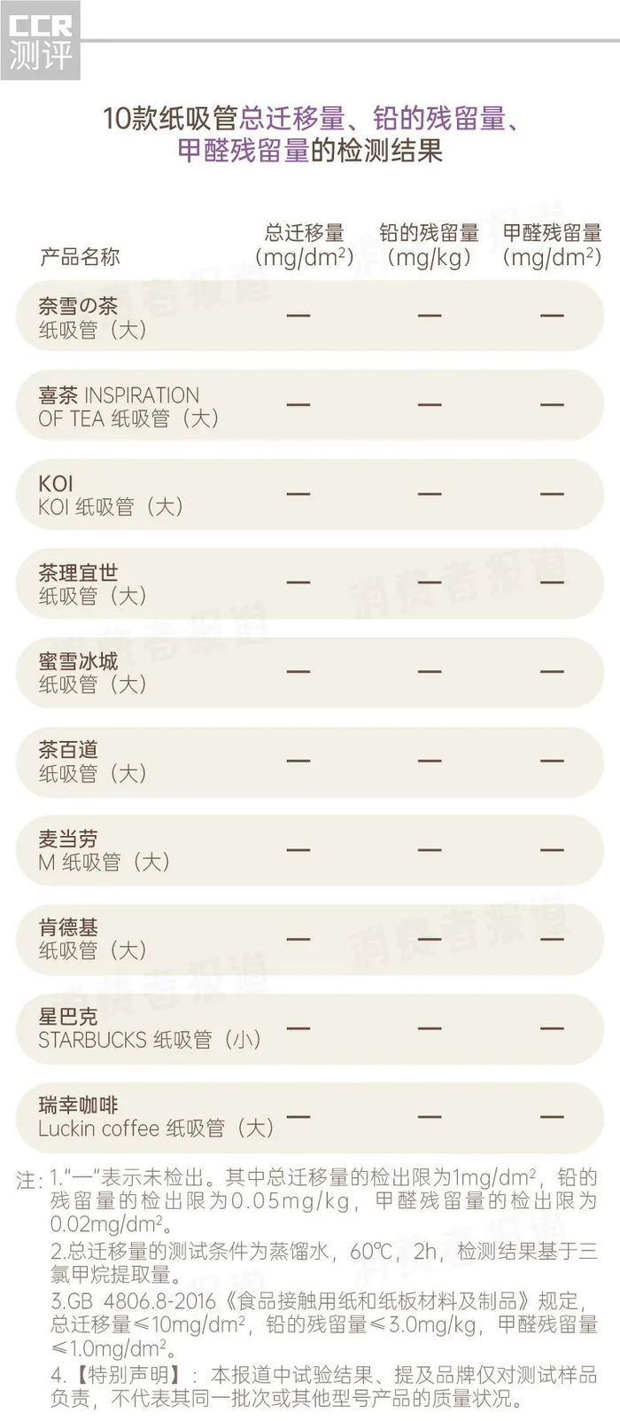 1、10款纸吸管均未检出总迁移量、铅的残留量、甲醛残留量。