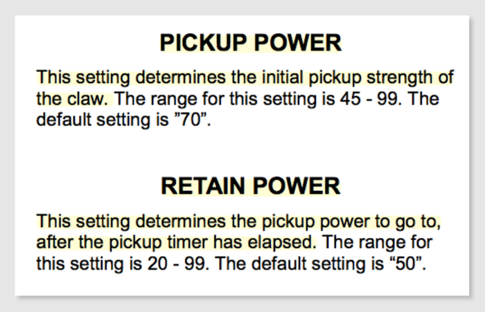 比如下面这款,它的钢爪力度可以人为设置,而且可以分为抓取和拾起两个阶段分别设置。抓取的默认力度值为 70;而拾起的默认力度为 50。两个阶段力度的切换瞬间,就是娃娃机的“手滑”时刻。