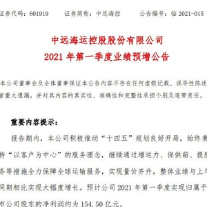 中远海控是间接控股股东中国远洋海运集团核心产业中重要的组成部分,系承担集装箱航运服务供应链的上市平台。4月6日晚间披露业绩预告,一季度中远海控预盈154.5亿元。相比,上年同期净利润约为2.92亿元。