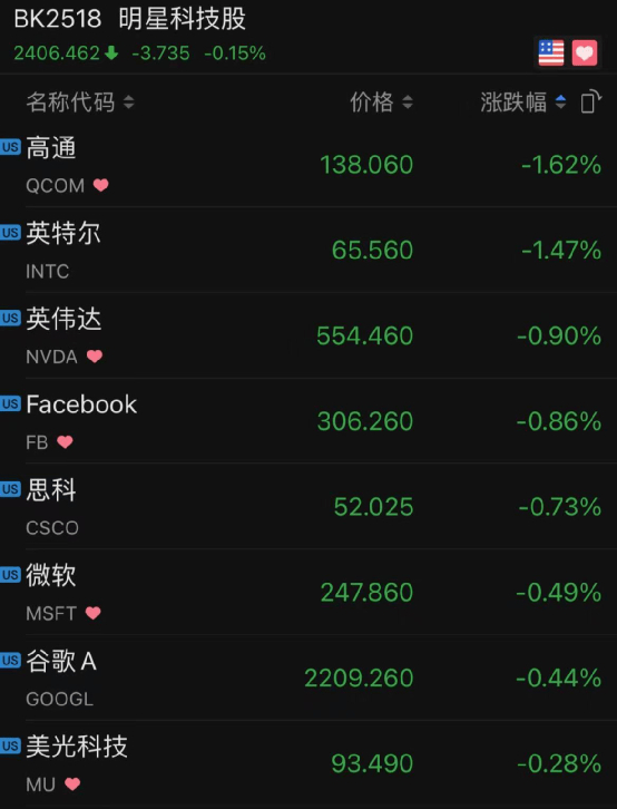 大型科技股在昨日普涨后今天也开启分化,亚马逊跌0.09%,谷歌跌0.04%,Facebook跌0.86%,微软跌0.49%,高通跌1.62%,英特尔跌1.47%。苹果涨0.25%,特斯拉涨0.08%,AMD涨0.01%,奈飞涨0.71%。