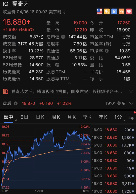 中概股普涨跟谁学涨14%,爱奇艺涨10%