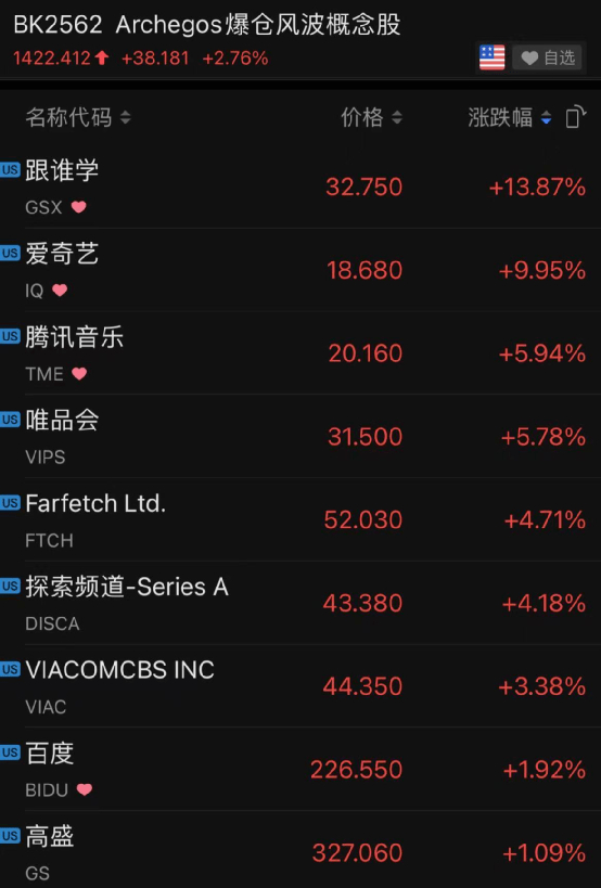 周一,Archegos爆仓概念股整体反弹。上述上涨的中概股中,不少是受Archegos爆仓事件波及的概念股,包括跟谁学、爱奇艺、腾讯音乐等。