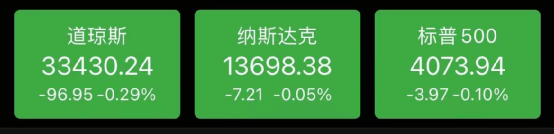 周二,美股三大股指窄幅震荡,截至收盘,三大股指集体收跌,标普500指数跌0.10%,报4073.94点。纳斯达克指数跌0.05%,报13698.38点。道琼斯指数跌0.29%,报33430.24点。