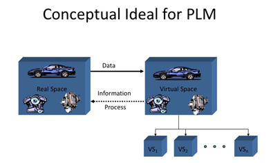 2002年Michael Grieves在密歇根大学为PLM(产品生命周期管理)中心成立而向工业界发表演讲而制作的幻灯片中,首次提出了PLM概念模型,模型中出现了现实空间,虚拟空间,从现实空间到虚拟空间的数据流,从虚拟空间到现实空间的信息流,以及虚拟子空间的表述,见下图。