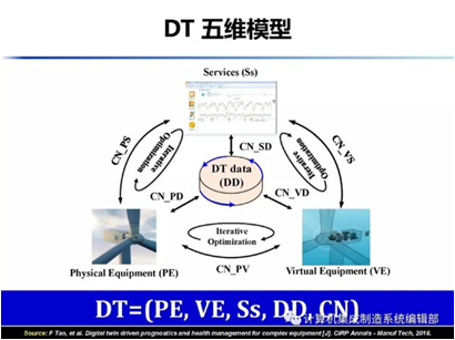 北京航空航天大学的陶飞等在CIMS期刊上的《数字孪生五维模型及十大领域应用》,给出了数字孪生的五维模型,MDT=(PE,VE,Ss,DD,CN)。MDT是一个通用的参考架构,孪生数据(DD)集成融合了信息数据与物理数据,服务(Ss)对数字孪生应用过程中面向不同领域、不同层次用户、不同业务所需的各类数据、模型、算法、仿真、结果等进行服务化封装,连接(CN)实现物理实体、虚拟实体、服务及数据之间的普适工业互联,虚拟实体(VE)从多维度、多空间尺度、及多时间尺度对物理实体进行刻画和描述。五维模型,对数字孪生的落地具有重要的指导意义,在工程应用中,可以直接将该模型映射或转换为面向服务的软件体系结构。