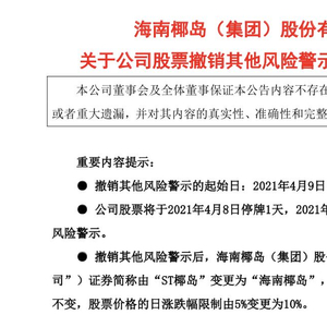 根据《上海证券交易所股票上市规则》相关规定,海南椰岛股票将于2021年4月8日停牌1天,2021年4月9日起复牌并撤销其他风险警示,撤销其他风险警示后公司股票价格的日涨跌幅限制为10%,公司证券简称将由“ST椰岛”变更为“海南椰岛”。