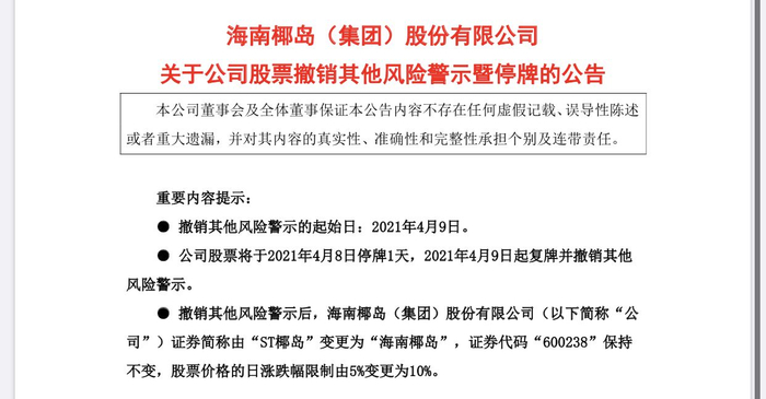 新京报讯 4月7日,海南椰岛(集团)股份有限公司(以下简称“海南椰岛”)发布关于公司股票撤销其他风险警示暨停牌的公告。