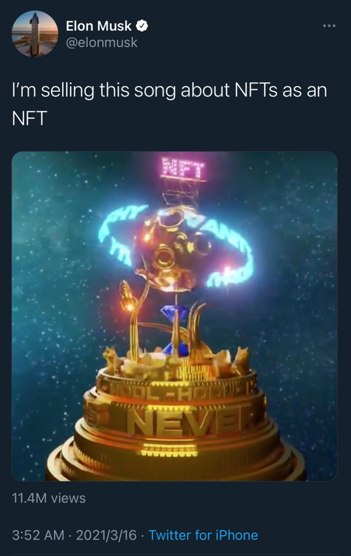 3 月 16 日,马斯克发了一条推文,要将一首有关 NFT 的歌当做 NFT 出售。(带货大魔王成功让 Clubhouse 出圈之后开始推 NFT 了?)