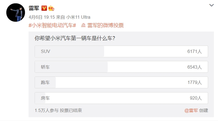 雷军4月6日晚还在微博发起针对小米汽车的投票,结果显示,大部分人希望小米汽车采取小米的自有品牌,投票最多的车型为轿车和SUV;价格方面,10万元-30万元区间的投票合计超二分之一。