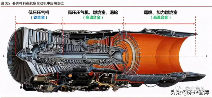 若不考虑控制系统,航空发动机从制造成本角度看原材料成本占比约 50%,人工成本 占比约 25%。航空发动机中使用的材料主要有高温合金、钛合金、复合材料、合金钢、铝 合金等。航空发动机中所采用的高温合金涉及的主要材料是镍、钴金属。高温合金占比约 35%、钛合金占比约 30%,其他合金及复材占比约 35%。