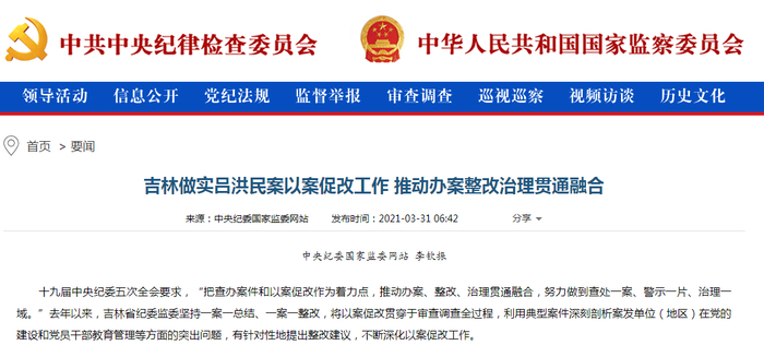 上官河(微信ID:sg_river)发现,就在一周前(3月31日),中央纪委国家监委网站刊发《吉林做实吕洪民案以案促改工作推动办案整改治理贯通融合》,表示要利用典型案件深刻剖析案发单位(地区)在党的建设和党员干部教育管理等方面的突出问题,有针对性地提出整改建议,不断深化以案促改工作。