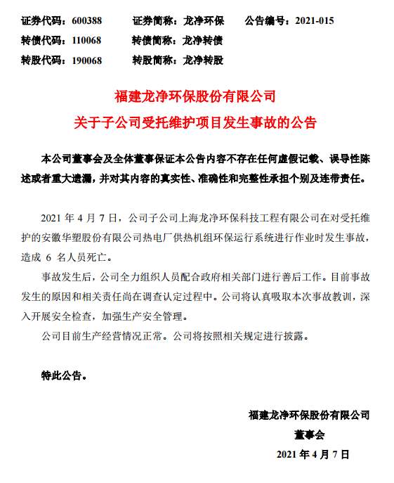 4月7日晚间,龙净环保发布公告回应闪爆事故最新进展。公司确认,子公司上海龙净环保科技工程有限公司(下称“上海工程”)在对受托维护的安徽华塑股份有限公司(下称“华塑股份”)热电厂供热机组环保运行系统进行作业时发生事故,造成6名人员死亡。