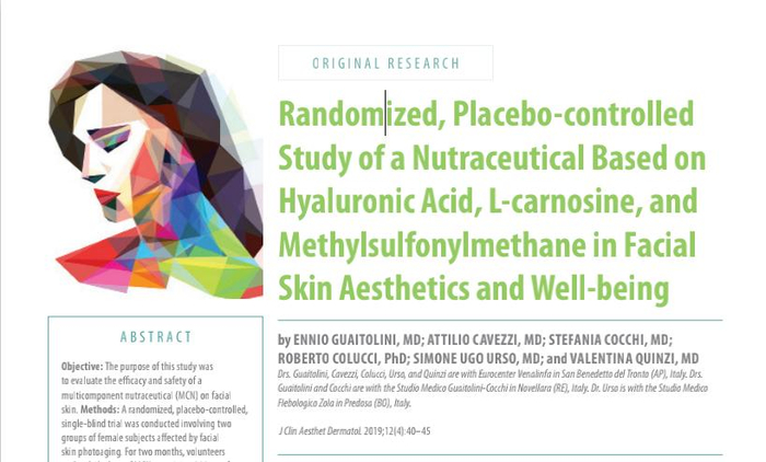 [2] Guaitolini E , Cavezzi A , Cocchi S , et al. Randomized, Placebo-controlled Study of a Nutraceutical Based on Hyaluronic Acid, L-carnosine, and Methylsulfonylmethane in Facial Skin Aesthetics and Well-being[J]. The Journal of Clinical and Aesthetic Dermatology, 2019, 12(4).