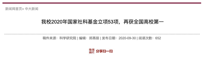 国社科立项数第一,图片来源:中大官网与科研经费暴涨匹配的,还有科研项目立项数。三年时间里,中大国自然项目立项数跃居第二,国家社科基金项目和教育部人文社科项目立项数抢得第一,独霸至今。