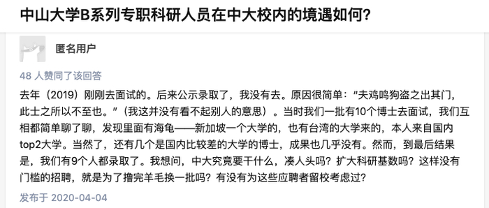 匿名网友的分享,图片来源:知乎某位 2019 年参加中大专职科研岗招聘的网友说,同去的 10 人,竟然有 9 人被录取,连那些科研成果较差,论文数量和质量堪忧的博士也能拿到 offer。