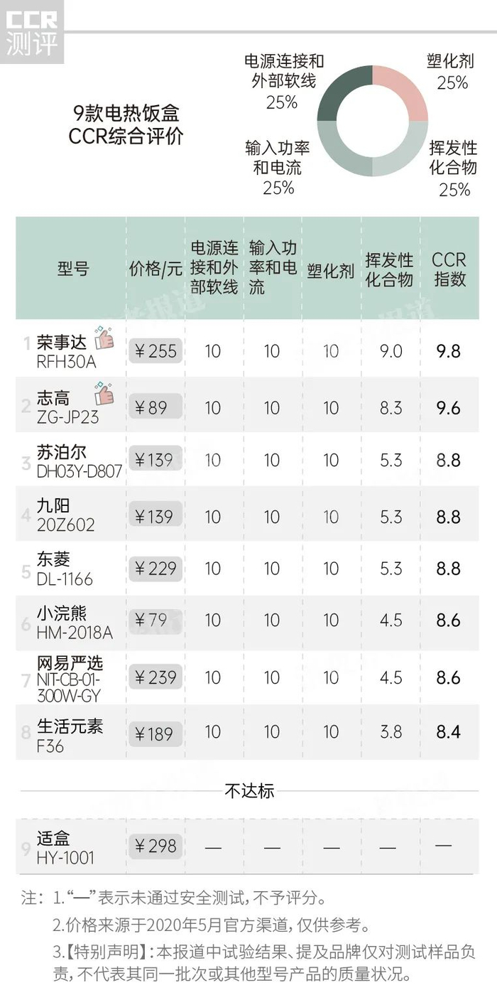 本刊推荐荣事达、志高等2款电热饭盒,CCR得分分别高达9.8和9.6分,4项指标全部达标,没有材质、安全上的危险和隐患,消费者可放心使用。