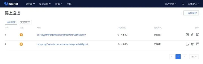 此外,链上天眼还具有强大的链上监控功能,用户可以根据需求,设置地址监控和交易监控,前者可以监控各类地址的动态,而后者则可以用来监控某笔交易中涉及到的资金。在Github事件中,将黑客地址添加到地址监控中,只要发生地址发生交易,用户就会收到邮件提醒,第一时间了解被盗地址的动向。