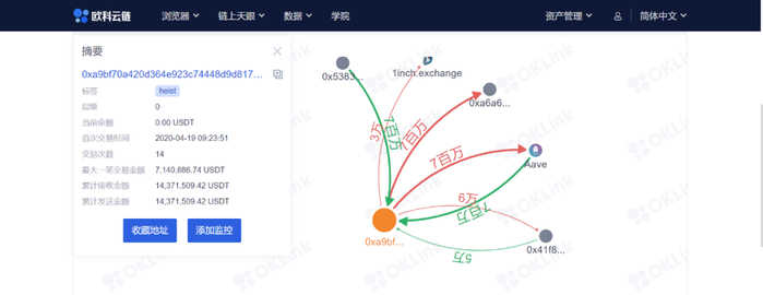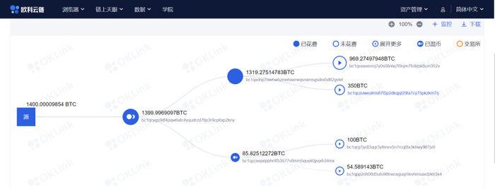 而借助交易图谱功能,只需要输入被盗用户转出时地交易哈希,根据需求设置好交易金额和层数(此处设置3层),就可以生成交易的可视化图谱,追踪这笔链上资产的流向。