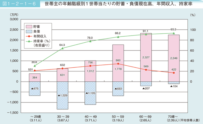 这是总务省2018年的调查数据,日本各年龄段家庭的资产情况。