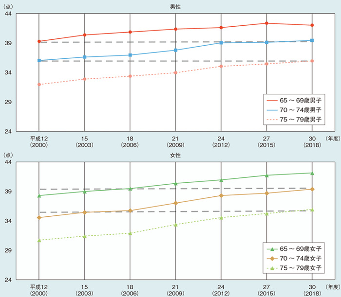 可以明显地发现,2018年时,70~74岁的日本男女,比2000年时65-69岁的日本男女体力更好,而且75~79岁的日本女子,也比18年前70~74岁的日本女子体力更好。