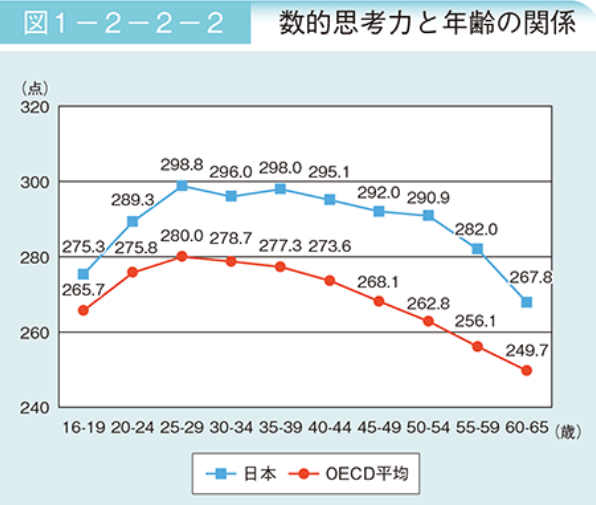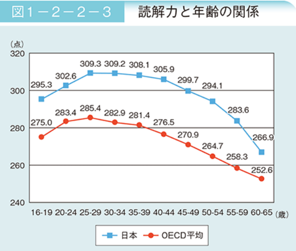 这两张图,分别是不同年龄段的数字思考能力以及阅读能力,日本老年人的平均水平,完爆OECD的平均水准。(OECD是世界发达国家最大的联盟组织)