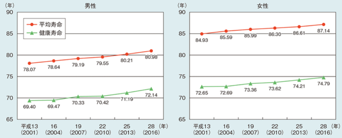 而日本人的健康寿命(身体状况完全不影响日常生活)同样长得可怕:2016年时,日本男性健康寿命72.14岁,女性高达74.79岁。