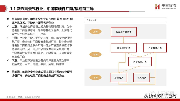 全球视角来看,网络安全行业以 “硬件-软件-服务” 构 建产品体系,下游客户覆盖各行各业。上游:网络安全产业链上游为基础硬件提供商,为中 游设备厂商提供芯片、内存等基础元器件,上游的代 表性公司包括英特尔、三星等。中游:产业链中游主要分为三类厂商,即安全硬件设 备厂商、安全软件厂商和安全集成厂商,其中安全硬 件设备厂商和安全软件厂商一部分产品直接供应给下 游最终用户,另一部分产品则提供给安全集成厂商, 中游代表性公司有赛门铁克、启明星辰、深信服等安 全集成厂商。下游:产业链下游主要为各类用户主要为政企客户, 包括政府、军工、电信、教育、金融、能源等。目前国内的网络安全上市公司主要以中游的安全硬件 设备厂商、安全软件厂商和安全集成厂商为主。