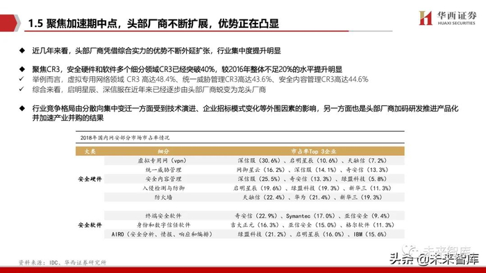 近几年来看,头部厂商凭借综合实力的优势不断外延扩张,行业集中度提升明显。聚焦CR3,安全硬件和软件多个细分领域CR3已经突破40%,较2016年整体不足20%的水平提升明显。举例而言,虚拟专用网络领域 CR3 高达48.4%、统一威胁管理CR3高达43.6%、安全内容管理CR3高达44.6% ✓ 综合来看,启明星辰、深信服在近年来已经逐步由头部厂商蜕变为龙头厂商。行业竞争格局由分散向集中变迁一方面受到技术演进、企业招标模式变化等外围因素的影响,另一方面也是头部厂商加码研发推进产品化 并加速产业并购的结果。