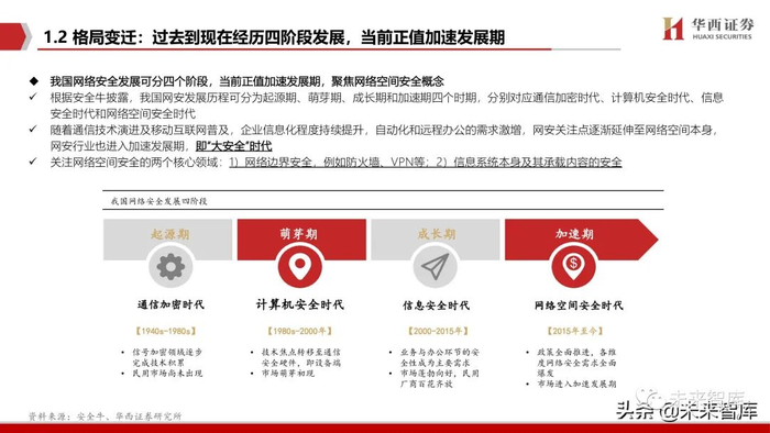 我国网络安全发展可分四个阶段,当前正值加速发展期,聚焦网络空间安全概念。根据安全牛披露,我国网安发展历程可分为起源期、萌芽期、成长期和加速期四个时期,分别对应通信加密时代、计算机安全时代、信息 安全时代和网络空间安全时代。随着通信技术演进及移动互联网普及,企业信息化程度持续提升,自动化和远程办公的需求激增,网安关注点逐渐延伸至网络空间本身, 网安行业也进入加速发展期,即“大安全”时代。关注网络空间安全的两个核心领域:1)网络边界安全,例如防火墙、VPN等;2)信息系统本身及其承载内容的安全。