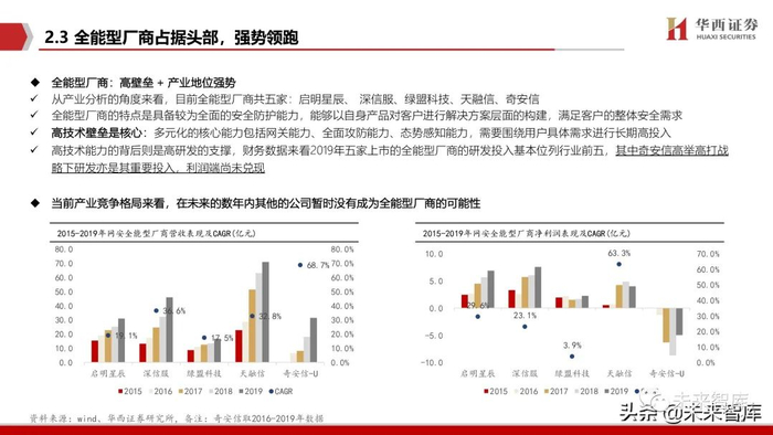 全能型厂商:高壁垒 + 产业地位强势。从产业分析的角度来看,目前全能型厂商共五家:启明星辰、 深信服、绿盟科技、天融信、奇安信。全能型厂商的特点是具备较为全面的安全防护能力,能够以自身产品对客户进行解决方案层面的构建,满足客户的整体安全需求。高技术壁垒是核心:多元化的核心能力包括网关能力、全面攻防能力、态势感知能力,需要围绕用户具体需求进行长期高投入。高技术能力的背后则是高研发的支撑,财务数据来看2019年五家上市的全能型厂商的研发投入基本位列行业前五,其中奇安信高举高打战 略下研发亦是其重要投入,利润端尚未兑现。当前产业竞争格局来看,在未来的数年内其他的公司暂时没有成为全能型厂商的可能性。