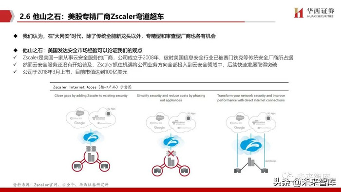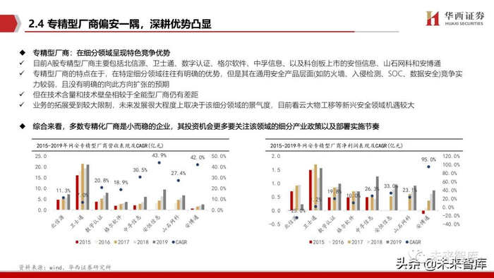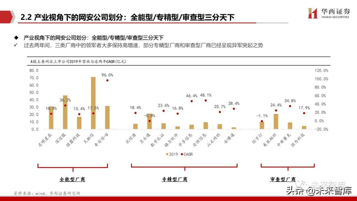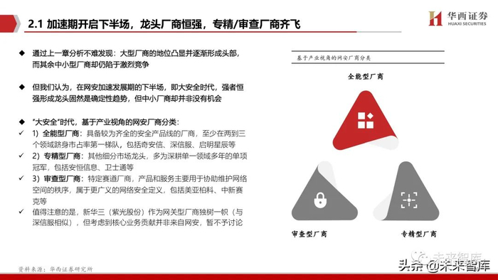 “大安全“时代,基于产业视角的网安厂商分类: 1)全能型厂商:具备较为齐全的安全产品线的厂商,至少在两到三 个领域跻身市占率第一梯队,包括奇安信、深信服、启明星辰等;2)专精型厂商:其他细分市场龙头,多为深耕单一领域多年的单项 冠军,包括安恒信息、卫士通等;3)审查型厂商:特定赛道厂商,产品和服务主要用于协助维护网络 空间的秩序,属于更广义的网络安全定义,包括美亚柏科、中新赛 克等;值得注意的是,新华三(紫光股份)作为网关型厂商独树一帜(与 深信服相似),但考虑到核心业务贡献并非来自网安,暂不予讨论。