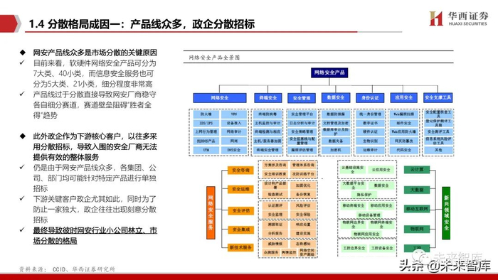 此外政企作为下游核心客户,以往多采 用分散招标,导致入围的安全厂商无法 提供有效的整体服务:仍是由于网安产品线众多,各集团、公 司、部门均可能针对特定产品进行单独 招标。下游关键客户政企尤其如此,同时为了 防止一家独大,政企往往出现刻意分散 招标。最终导致彼时网安行业小公司林立、市 场分散的格局。