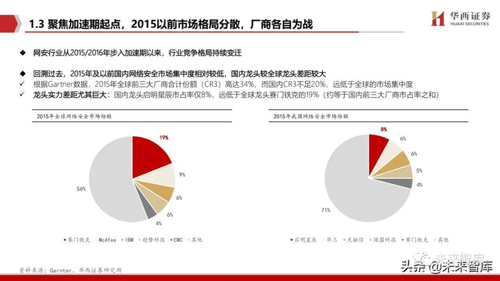 网安行业从2015/2016年步入加速期以来,行业竞争格局持续变迁。回溯过去,2015年及以前国内网络安全市场集中度相对较低,国内龙头较全球龙头差距较大。根据Gartner数据,2015年全球前三大厂商合计份额(CR3)高达34%,而国内CR3不足20%,远低于全球的市场集中度。龙头实力差距尤其巨大:国内龙头启明星辰市占率仅8%,远低于全球龙头赛门铁克的19%(约等于国内前三大厂商市占率之和)。