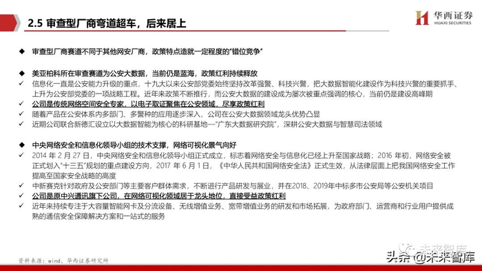 审查型厂商:受益网络空间治理,政策驱动特点鲜明。网络空间治理近年受到高度关注。该产业下游往往为政法系统单位,在关键技术、产品、标准和渠道方面具有相对明确的进入门槛,产业竞争格局稳定,新进入者少。此外,网络空间治理涉及到一些大数据的能力和实施经验,这也构成了产业的壁垒。