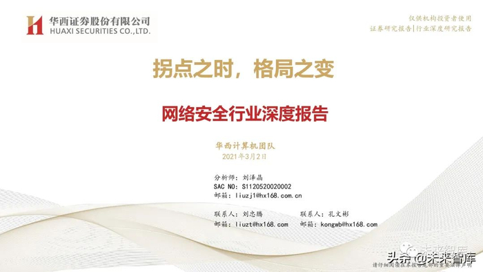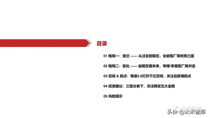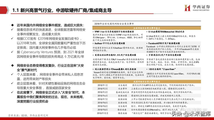 网络安全态势变得愈发复杂,行业正在迎来“大安 全”景气新时代。个人层面来看 ,网络安全事件会带来私人信息泄 露,进而带来财产等损失。政企层面来看,针对关键性基础设施的网络攻击会 导致重大安全事故 ,直接威胁国家安全。在此背景下,网络安全正式步入“大安全”时代,本 篇报告中我们聚焦网安的过去、现在、未来格局, 深度挖掘行业投资机会。