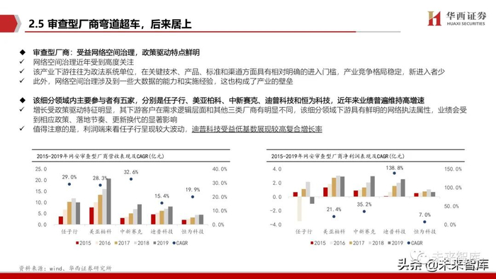 该细分领域内主要参与者有五家,分别是任子行、美亚柏科、中新赛克、迪普科技和恒为科技,近年来业绩普遍维持高增速。增长受政策驱动特征明显,其下游客户在需求逻辑层面和其他三类厂商有明显不同,该细分领域下游具有鲜明的网络执法属性,业绩会受 到相应政策、落地节奏、更新换代的显著影响。值得注意的是,利润端来看任子行呈现较大波动,迪普科技受益低基数展现较高复合增长率。